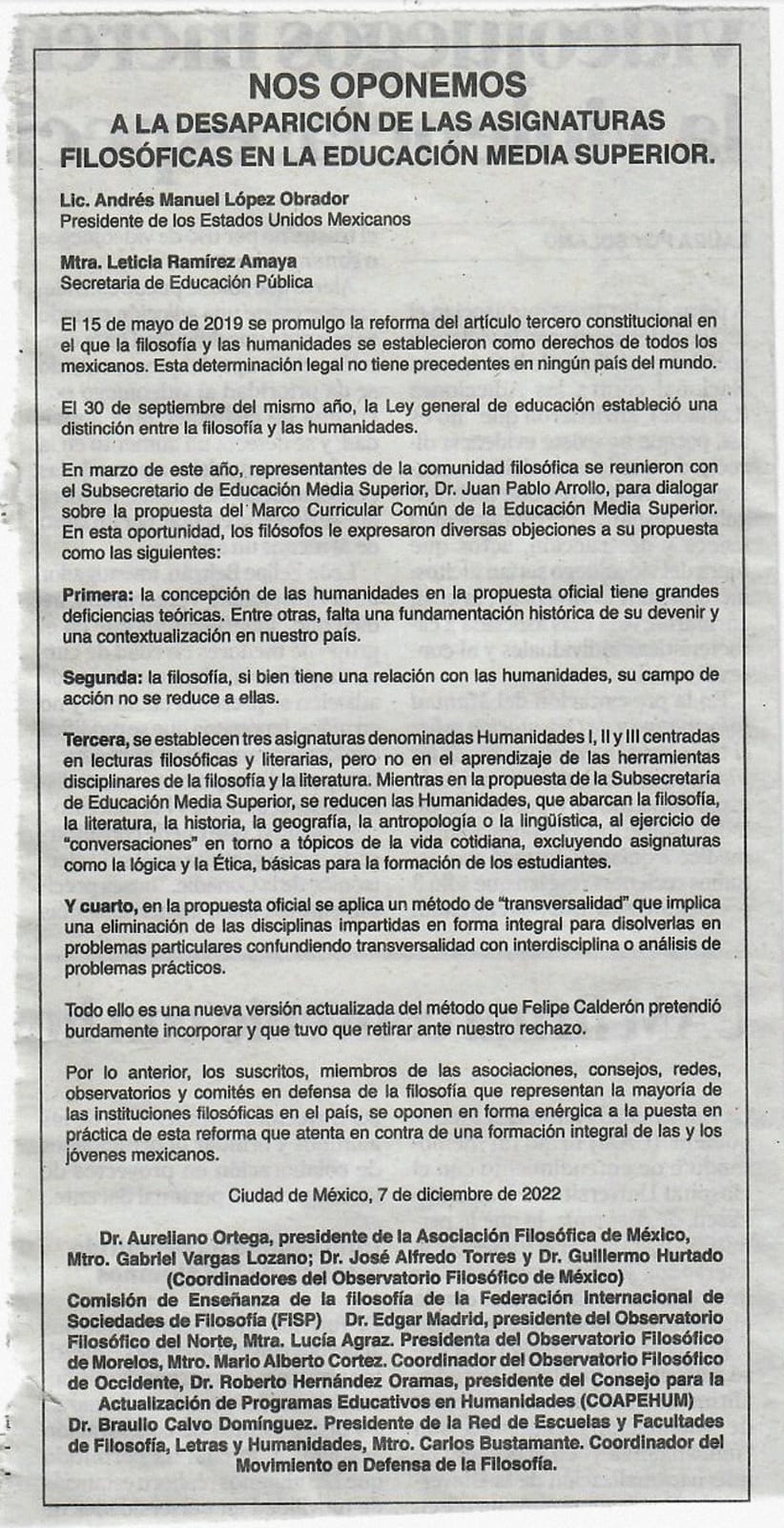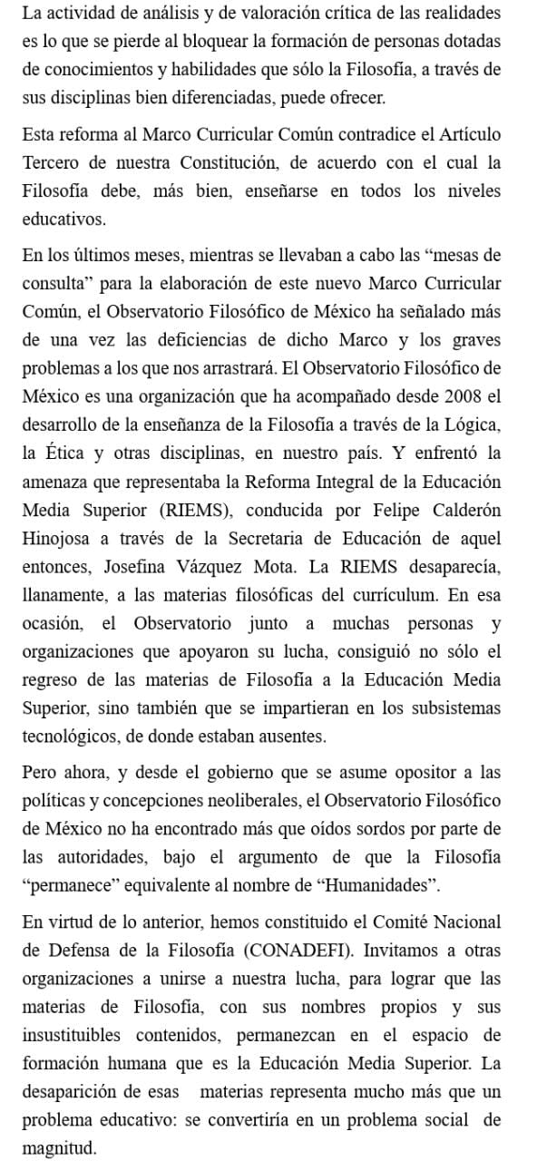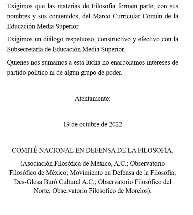 Por lo anterior, los suscritos, miembros de las asociaciones, consejos, redes, observatorios y comités en defensa de la filosofía que representan la mayoría de las instituciones filosóficas en el país, se oponen en forma enérgica a la puesta en práctica de esta reforma que atenta en contra de una formación integral de las y los jóvenes mexicanos.